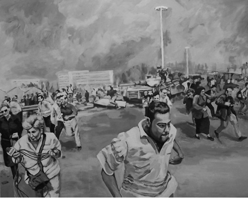 En efecto, los filósofos apenas hablan ya del mundo, siendo la historia de la filosofía, en su interpretación, el instrumento de manifestación prioritaria de las ideas. Algo parecido sucede con la pintura y Rafael Cebrián y Ernesto Herrero se remiten al pop art. Reinterpretan el pop apropiándose de una de sus maneras más significativas, como es la utilización de los recursos de un medio de masas, de sus elementos formales más característicos, construyendo así una imagen de la imagen, una pintura de la fotografía que miraba a su modo los hechos. Fotos en blanco y negro, además. Los colores no aparecen y así no hay lugar para las dudas. Remitirse a lo real sólo como significado en última instancia, como resultado final de la cadena del sentido, como motivo último obligatorio del signo (equiparándolo así, pues, a la misma idea de Dios, concebido desde san Agustín como el significado de todos los significados).