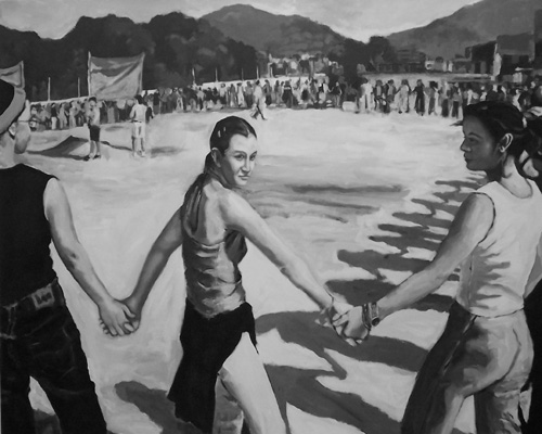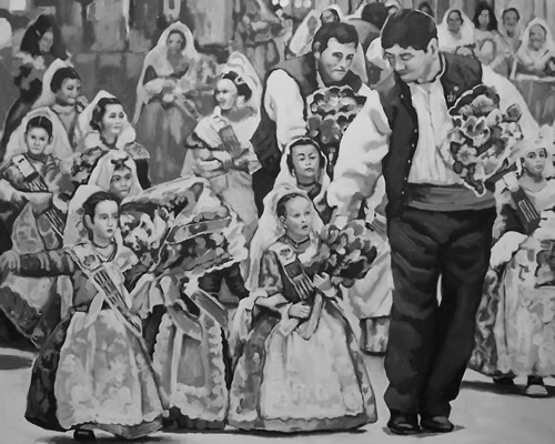 Pero ¿son de verdad escogidas al azar las fotografías que sirven de modelos inmóviles a los pintores? Imposible afirmar semejante idea; el inconsciente trabaja determinando la elección aunque nadie se percate de ello, por lo que ciertos elementos promueven el interés de los autores para interpretar en el lienzo los rasgos fotográficos. Así, por ejemplo, aunque pueda decirse que Soldados de la fragata Navarra no ha sido pintada debido al tema militar, es inevitable reconocer la potencia de la horizontalidad de los soldados tumbados prolongados por los fusiles ametralladores; quizá también sea preciso señalar la presencia de materiales muy diversos (carnes de las piernas y los brazos, telas de las ropas, barandillas metálicas, cuerdas…) que son tratados con el mismo tipo de disposición del óleo, jugando al enfoque y el desenfoque para afirmar la potencia superficial de las pinceladas. En otro cuadro, Cadena humana, el formato horizontal no es subrayado por lo pintado, sino complementado por la verticalidad de las tres figuras en pie que marcan el primer plano; resalta aquí con más fuerza, sin embargo, la oposición entre la claridad de todo el centro del lienzo y los tonos negros que se hallan en las montañas y algunas ropas. También el claroscuro organiza La ofrenda de flores, jugando aquí los artistas a una simplificación de los rasgos faciales de la veintena de falleras y los dos hombres que las acompañan.